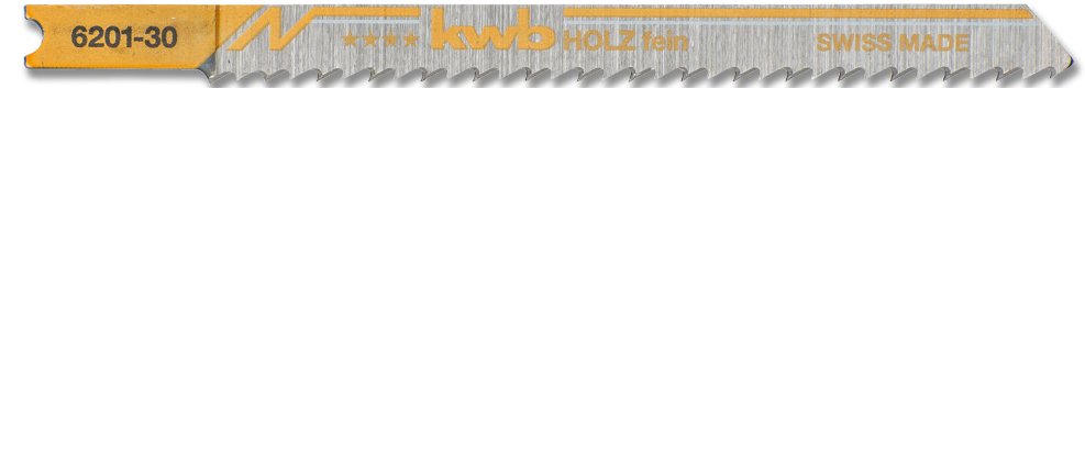 Jigsaw blades, BIM, bimetal, hardened teeth crosswise honed freiwinkel- and conical, fast, clean cuts, with piercing teeth, coated for easy dipping, wood, hardwood, chipboard, joinery and fiberboard, plastic panels, soft plastics and glass fiber reinforced plastics.