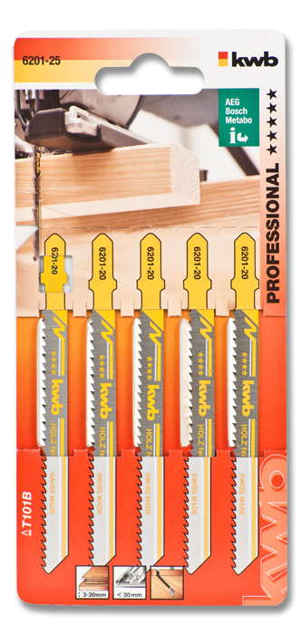 Jigsaw blades, BIM, bimetal, hardened teeth crosswise honed freiwinkel- and conical, fast, clean cuts, with piercing teeth, coated for easy dipping, wood, hardwood, chipboard, joinery and fiberboard, plastic panels, soft plastics and glass fiber reinforced plastics.