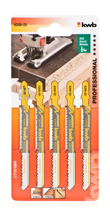 kwb 620825. Product type: Jigsaw blade, Suitable for materials: Chipboard, Plastic, Plywood, Wood, Blade material: High carbon steel (HCS). Working length: 7.5 cm, Blade tooth spacing: 2.5 mm. Overall length: 10 cm. Quantity per pack: 5 pc(s)