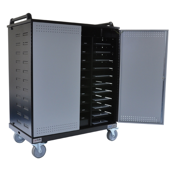 Its safe charging functionality means that no users can come into contact with 240-volt power and all devices are charged simultaneously via the unique LapSafe power management system that eliminates tripped fuses or circuit breakers. AC adaptors are housed in the rear of the trolley in its unique cable management system. Twin thermostatic fans ensure an optimum charging temperature is maintained.