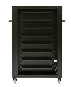 This cart is universal and can be used for all types of tablets. Tablets are stored vertically on a protective foam and charged with the charging units accompanying the tablets. The charging plug is passed through the fixed partition, hereby avoiding the usual cable chaos. This version