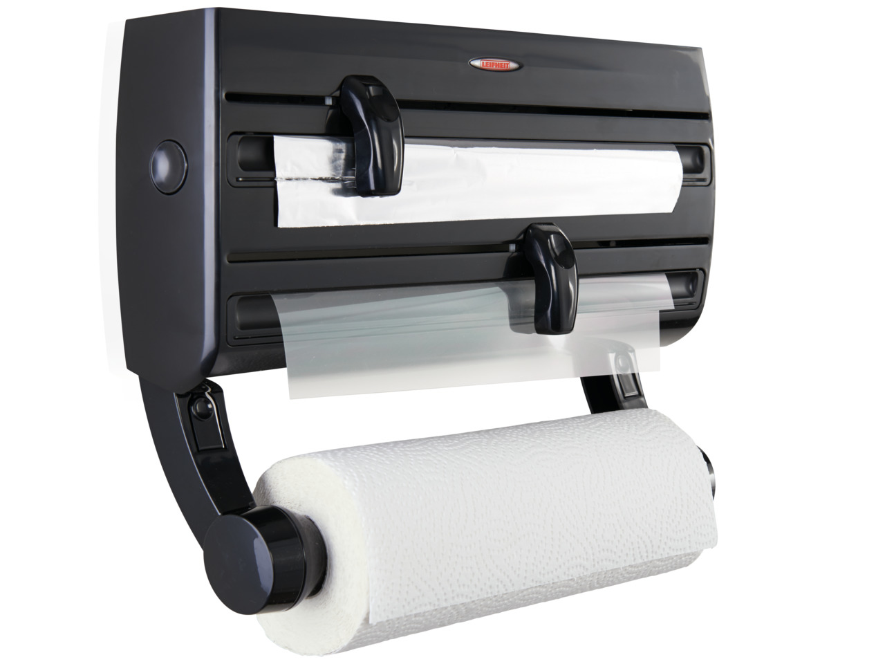 Nice to have everything to hand: aluminium foil and cling film, kitchen roll, spices. All finds its place in the wall-mounted roll holder Parat F2. Spices can be put on the practical storage shelf. Aluminium foil and cling film are in two closed containers, the kitchen roll is ready to hand on a third holder, which is removable and equipped with an integrated brake for the controlled tearing off of kitchen rolls sheet for sheet. The razor-sharp blades are also practical. They tear off aluminium foils and cling films neat and precise, without crooked, picked tearing edges and without fiddling on the cling film, because the foil end is not found. After the cutting the foil ends are again ready to hand and can easily be cut. The blades are hidden behind the ergonomic shaped cutter, free from the risk of injury. After the installation the wall-mounted roll holder can be stored from the front easily and comfortable. It is suitable for all commercial roll sizes. The drill holes fit every Leifheit Parat models. Dowels and screws inclusive. Colour: black.