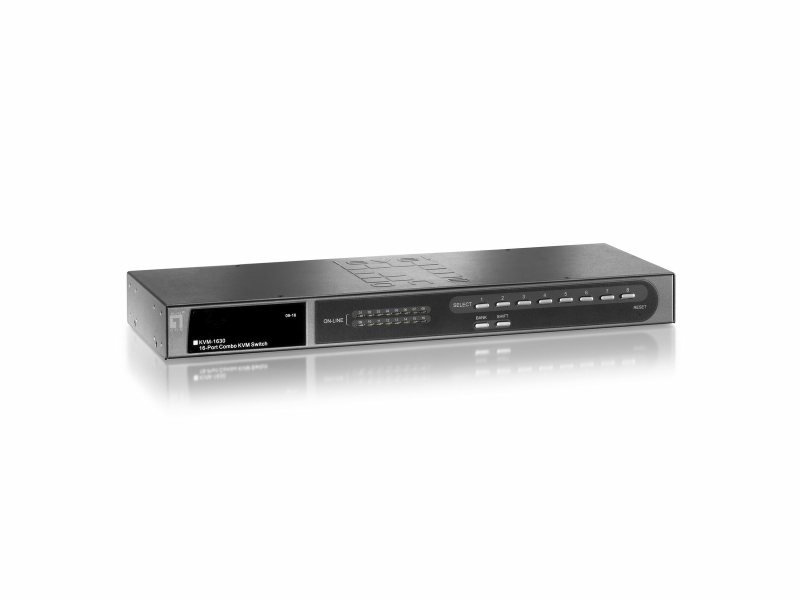 The LevelOne KVM-1630 16-port combo KVM switch enables users to control and manage a server farm or computers connected to the KVM switch with either the local console or remote console port.