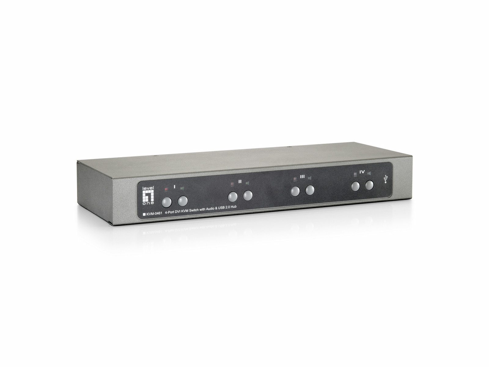 LevelOne KVM-0461 Switch allows you to share one USB keyboard, mouse, DVI monitor, and a set of speakers between 4 computers, which saves space and reduces peripherals clutter. The unit also features an integrated 2-port USB 2.0 hub for sharing USB devices such as an MP3 player, printer or external hard drive among connected computers. This high resolution KVM is capable of displaying up to 2560x1600 @ 60Hz, making it the perfect solution for imaging and multimedia environments. Multi-tasking is made easy with the built-in hotkeys or front panel push button for easy channel switching, and the independent audio-switching allows the user to play music from one computer while surfing the Internet from another.