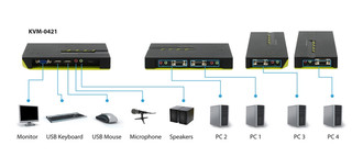 The LevelOne KVM-0421 connects four computer systems to a single USB keyboard, USB mouse and monitor. The 4-Port USB KVM Switch also provides audio support allowing users to connect the audio ports of each computer to the KVM switch.