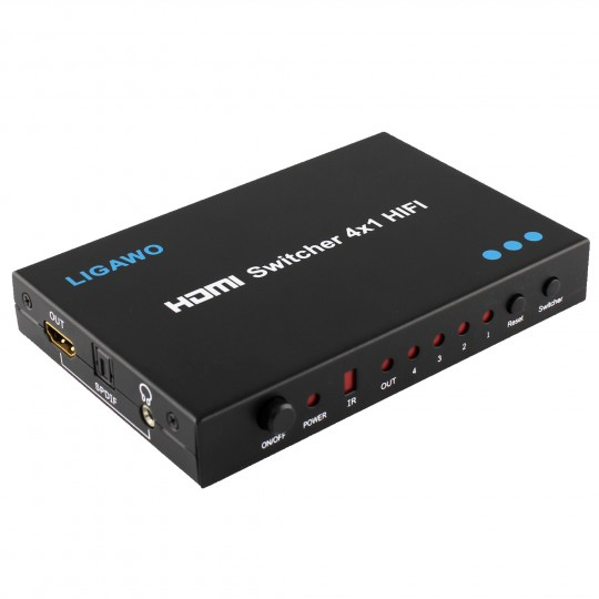 Der Ligawo 6518724 HDMI Switch Umschalter ermöglicht 4 HDMI Signale am Eingang auf einen Ausgang zu schalten. Zusätzlich erlaubt unser Audio HDMI Switch das Audiosignal parallel als optisch digital Toslink und 3,5mm Klinke auszugeben. Damit kann das Audiosignal unabhängig vom Bildsignal an eine Stereoanlage, Verstärker, Kopfhörer oder auch an 2 Geräte parallel ausgegeben werden.
