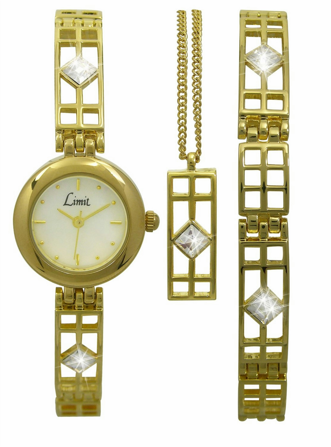 Gold plated stone set watch gift set w/mother of pearl dial