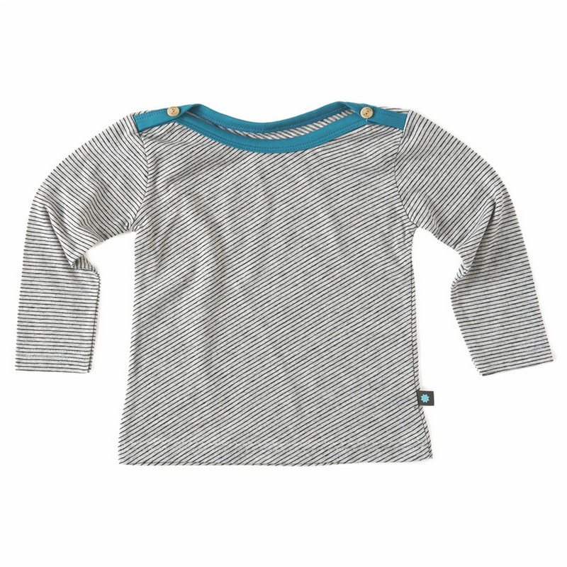Nice girl‘s T-shirt with boat neck. Long sleeves and beautiful small stripes grey black fabric. A small button on each shoulder. Material: jersey 95% cotton 5% elasthan.