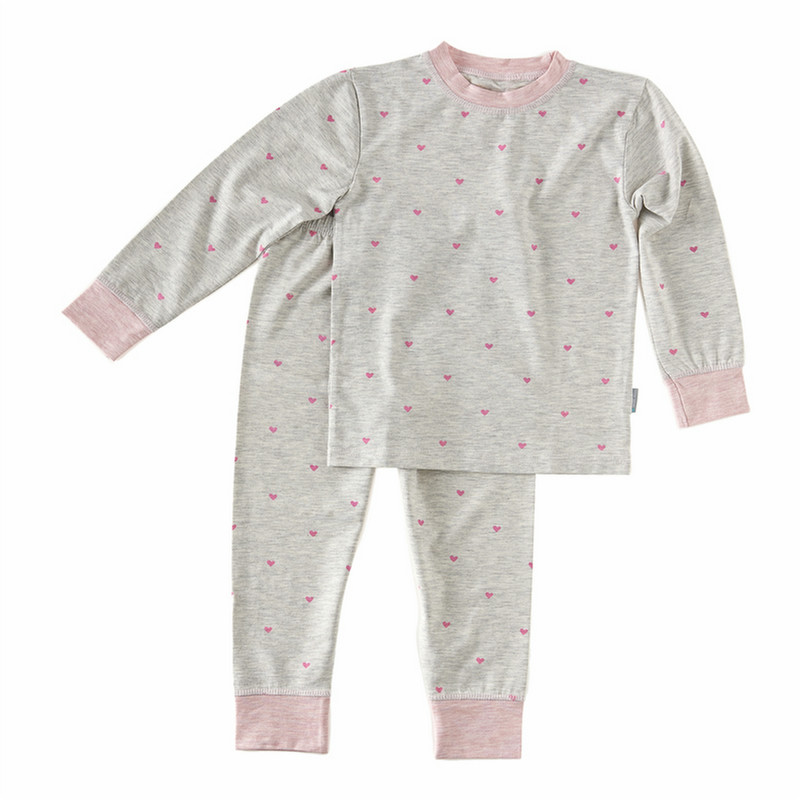Schlafanzug - grey melee with pink hearts, 92 Cutest 2-piece girl‘s pyjamas with a cute all-over-hearts pink print on grey melange. Ribbing at the sleeves, neckopening and pipes is in cool contrasting pink. The trousers have an elasticated waistband. We also have these PJ's for babies.