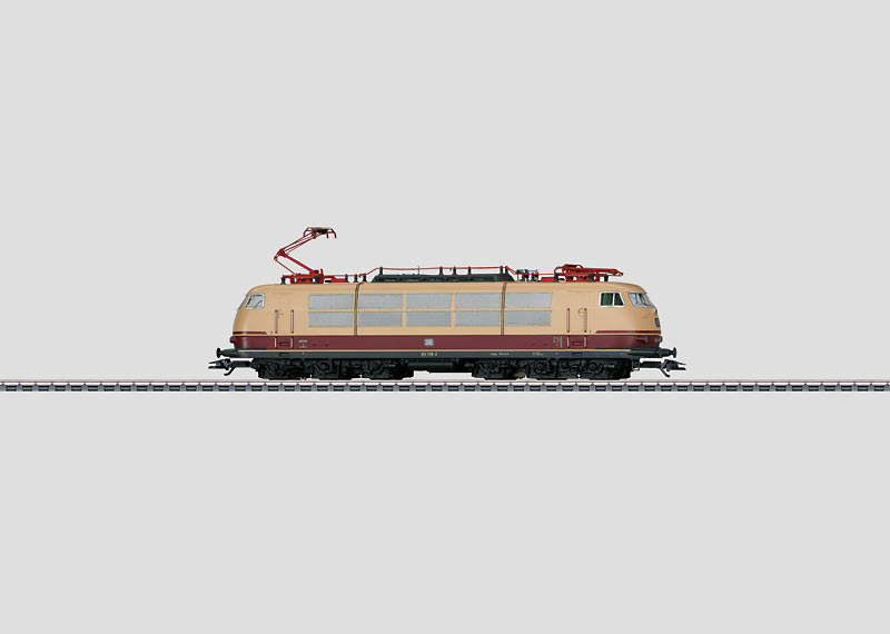 Prototype: German Federal Railroad (DB) class 103.1 electric locomotive in crimson/beige. With two rows of side vents, without end skirting, with buffer cladding, and single-arm pantographs. Used in IC service. The locomotive looks as it did at the start of the Eighties.