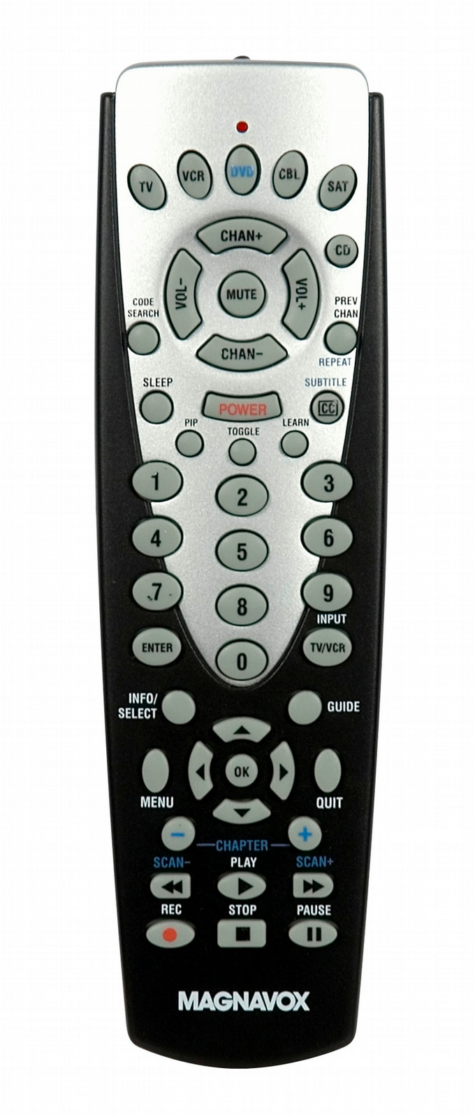 6 Device remote. Controls TV, cable, VCR, DVD, satellite and CD. Offers advanced DVD functions including subtitle, repeat and chapter scan plus satellite functions in an easy keypad design. Features learning capability.