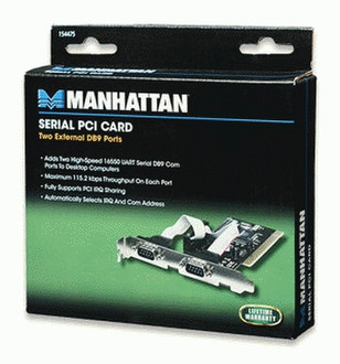 Compatible with most RS-232 peripherals, the MANHATTAN Serial PCI Card with two external DB9 ports is an ideal solution for attaching two serial devices — modems, barcode scanners, printers and more — through a single PCI card. Its two high-speed 16550 UART serial DB9 Com ports fully support PCI IRQ sharing even if accessed simultaneously to help save valuable resources for other expansion cards.
