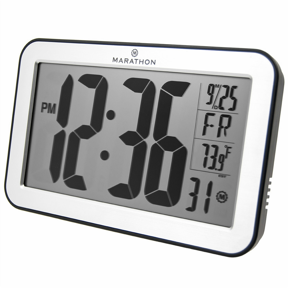 This Marathon atomic clock is self-adjusting and self-setting, eliminating the need to manually input the time and date. Simply insert the batteries provided with the clock and it will synchronize to the time set out by the atomic clock in Colorado once the signal is received. The clock includes all 8 North American time zones – a worldwide exclusive Marathon clock feature! It can be used anywhere within the North American continent and Hawaii. Choose from Pacific, Mountain, Central, Eastern, Atlantic, Newfoundland, Alaska and Hawaii standard time. The time and date can easily be set manually for those using the clock outside of North America and Hawaii. Daylight Savings Time on/off option is included. The clock’s sleek, contemporary design features a brushed steel effect frame and large numbers making this beautiful clock ideal for home, office, school, hospital, etc. It easily hangs on a wall or can be placed on a table top using the sturdy fold-out stand. Split-second accuracy shows the time in either AM/PM format or 24 hour military timing, along with the month, weekday and date, as well as indoor room temperature in Celsius or Fahrenheit.