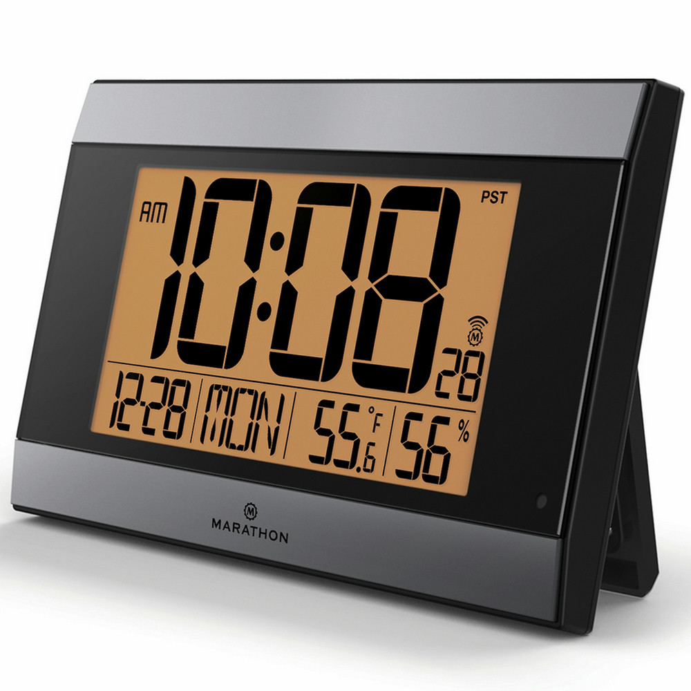 Marathon’s Digital Wall Clock With Temperature & Humidity is part of the new elite line. Although it is wall mountable, it also features a fold out table stand. The large, wide-angle, easy to read display has an ambient light sensor, which triggers a soft backlight when it is dark. You can easily switch between 6 time zones (Pacific, Mountain, Central, Eastern, Atlantic & Newfoundland), choose from 7 languages (English, Danish, Dutch, French, German, Italian & Spanish) and select Fahrenheit or Centigrade for the indoor temperature display. Along with the time, day, date and indoor temperature, this clock also displays indoor humidity. The CL030052 Digital Alarm Clock with Temperature & Humidity makes an excellent wall or desk clock and with an alarm and snooze function is also great as bedside alarm clock.