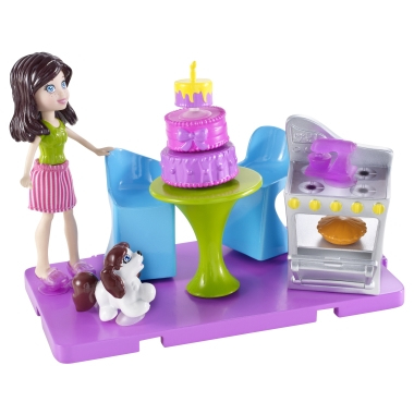 Why go out when it’s more fun hanging out at home? Build onto your Polly Pocket Hangout House (sold separately) with this ultra-stylish kitchen. You can use the Stick ‘n’ Play tiles to arrange the cute, colorful furniture and accessories any way you want! For more build-on adventures, check out Polly Pocket Game Room and Patio sets (sold separately).