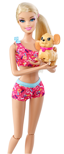 Ready, set, race! Barbie® doll's puppies really swim, and they love to see who is the fastest. Girls can wind up the puppies' ears and set them up on the slides where Barbie® doll, wearing her cute one-shoulder bikini, can start them off with activation of the mechanism in her back. Once they hit the water, the puppies are off! The pool should be filled to the first line to see them race down the channel. Girls can denote the champion by rotating the flag to the winner's lane. Fill the pool to the second line and watch the puppies swim freely. Girls can also have Barbie® carry her pets. When she lifts them up, they shake their wet ears all over her for realistic puppy play! Includes 1 Barbie® doll, 2 swimming puppies, pool, slide platform and flag.