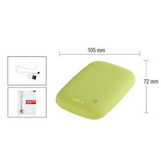 Maxfield Wireless Charging Powerbank 4.000. Colour of product: Green, Charger compatibility: Smartphone, Compatibility: Google Nexus 4 and Nexus 5 Nokia Lumia 920, 930, 1520, 720, 820. Battery capacity: 4000 mAh, Charging source: DC, Output voltage: 5 V. LED indicators: Charging. USB input port type: Micro-USB. Width: 105 mm, Depth: 72 mm, Height: 20 mm
