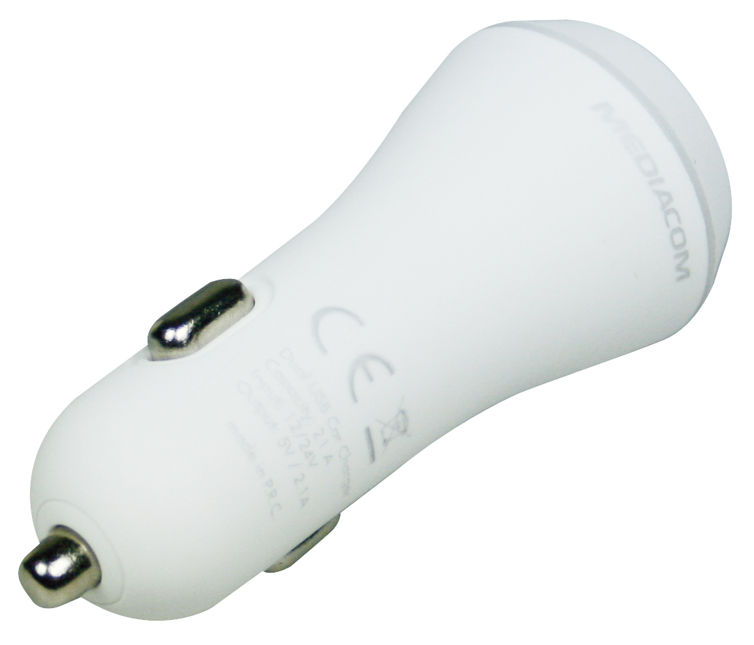 Mediacom M-2USBCRW. Charger type: Auto, Charger compatibility: Universal, Power source type: Cigar lighter. Colour of product: White. Input voltage: 12/24, Output voltage: 5 V, AC adapter output current: 2.1 A