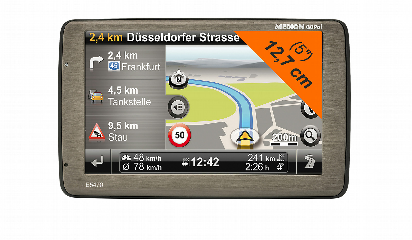 Medion GoPal E5470. Map coverage: Eastern Europe, Western Europe. Display diagonal: 12.7 cm (5"), Display resolution: 840 x 480 pixels. Storage media type: Flash, Internal storage capacity: 4 GB, Compatible memory cards: MicroSD (TransFlash), MicroSDHC. Processor model: SiRFatlasVI, Processor frequency: 800 MHz. Form factor: Fixed, Colour of product: Grey, Metallic