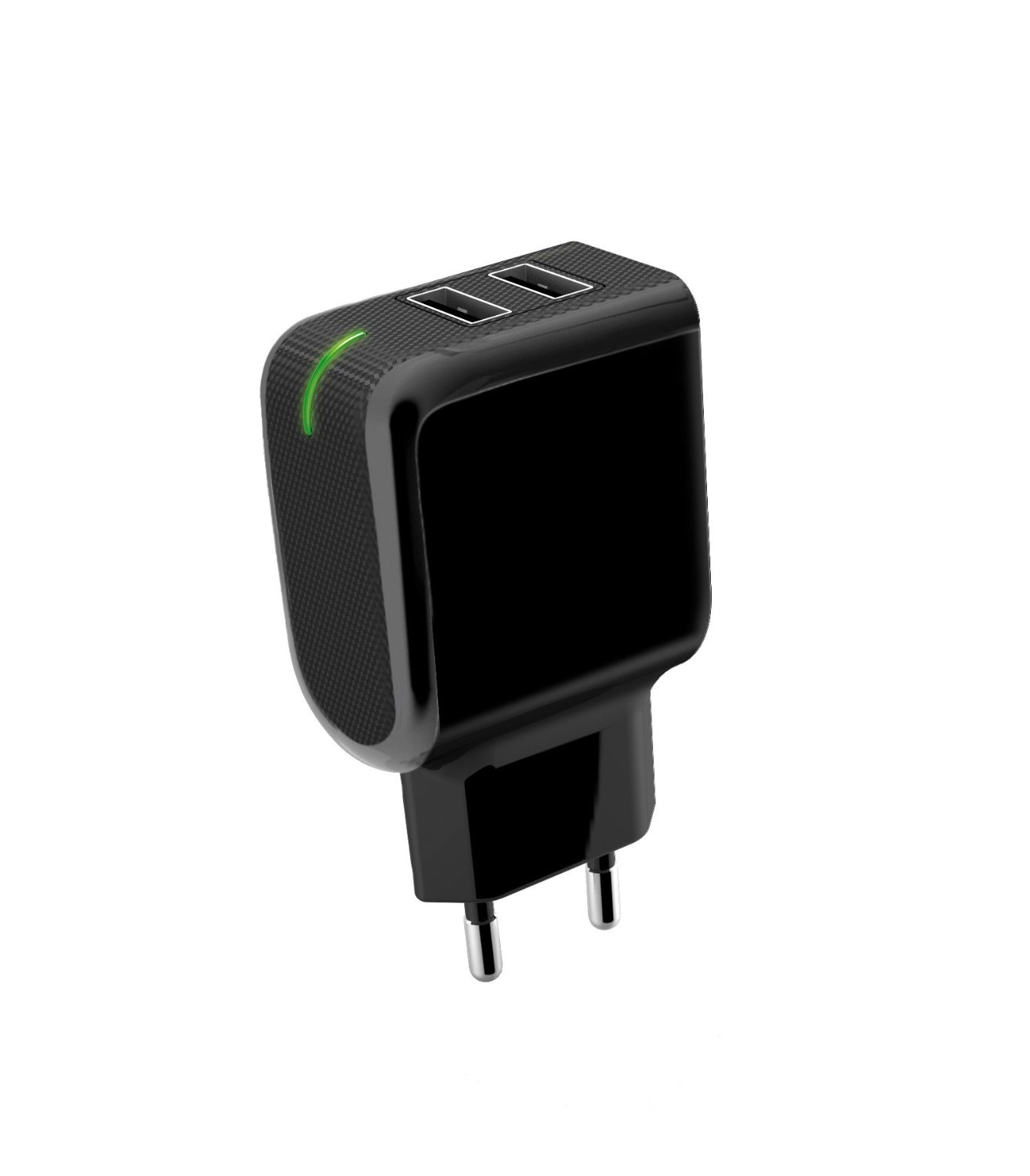 Practical travel charger fitted with a double universal USB port for charging any type of device via its own cable. Two smartphones or a tablet and a smartphone can be charged simultaneously. Prestigious carbon-effect finish.