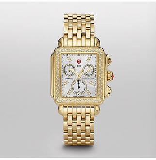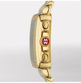 The rectangular case of the Signature Deco Diamond Gold Diamond Dial reflects the geometric shapes identified with Art Deco architecture. Brilliant diamonds surround the white dial with diamonds. A Swiss chronograph, subdial for the day of the week, and a gold plated stainless-steel bracelet add the finishing touch. The gold-plated bracelet is interchangeable with any 18mm Michele strap.