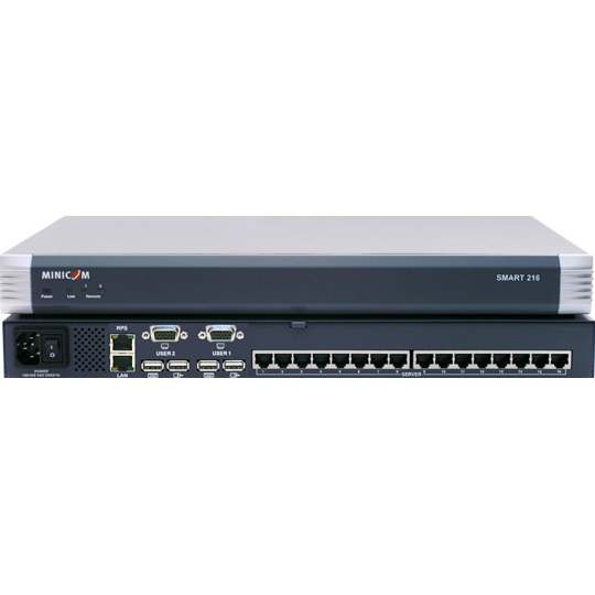 The Smart 216 is a thin 1U sized, rack-mountable device that saves critical space in crowded server room environments. It features Minicom KVM over CAT5 technology that directly connects the switch to each computer in the server room via a RICC/ROC dongle, eliminating cable clutter and extending the distance between server and switch up to 30m/100ft.