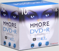 Write-once single-sided DVD 4.7 GB. For use in DVD+RW recorders and DVD+RW data drives (PC). MMORE ensures error-free recording during write cycles. DVD+R is read compatible with most DVD video and DVD-ROM drives.