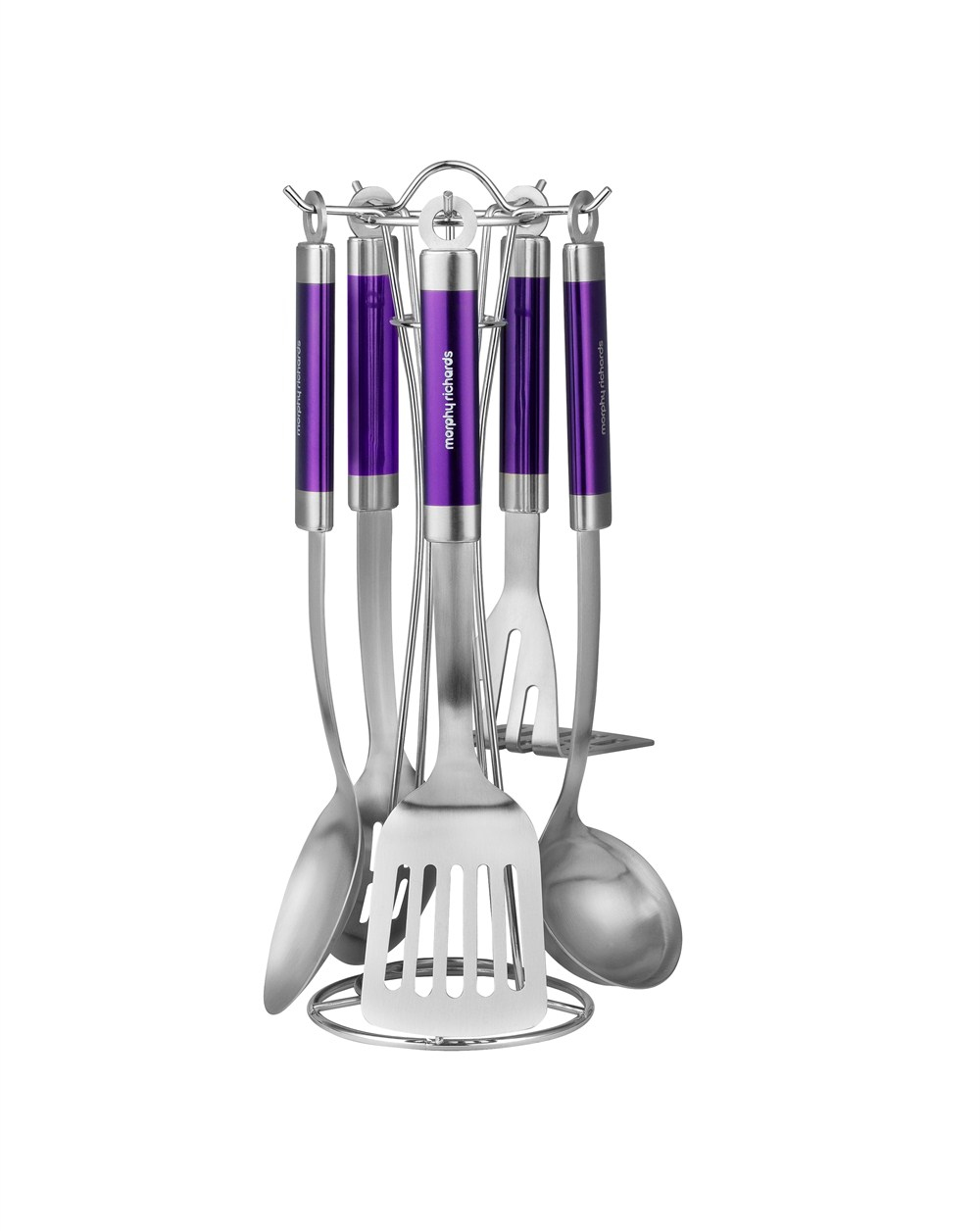 Colour match your Accents range with this 5 Piece Tool Set featuring Ladle, Masher, Slotted Turner, Cooks Spoon, Slotted Spoon and Stand in Plum