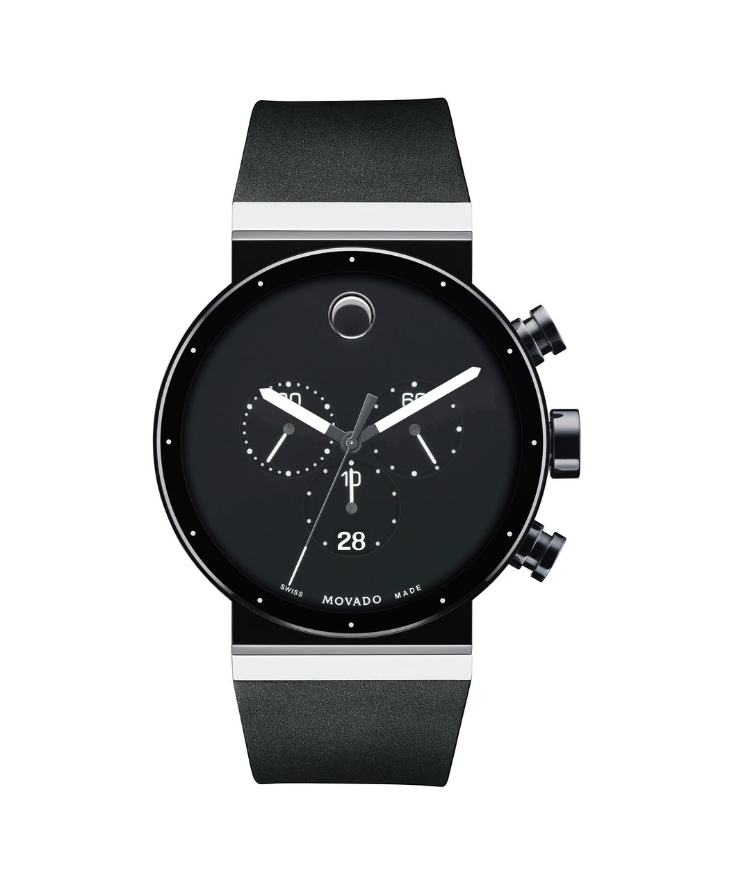 Men's Sapphire Synergy chronograph, 42 mm black PVD-finished and stainless steel bezel-free case with flat edge-to-edge sapphire crystal and white dot hour index, round black dial with 3 matching timing subdials, shiny-black signature dot, and white hands and dot indices, black rubber strap with black PVD-finished stainless steel deployment buckle.