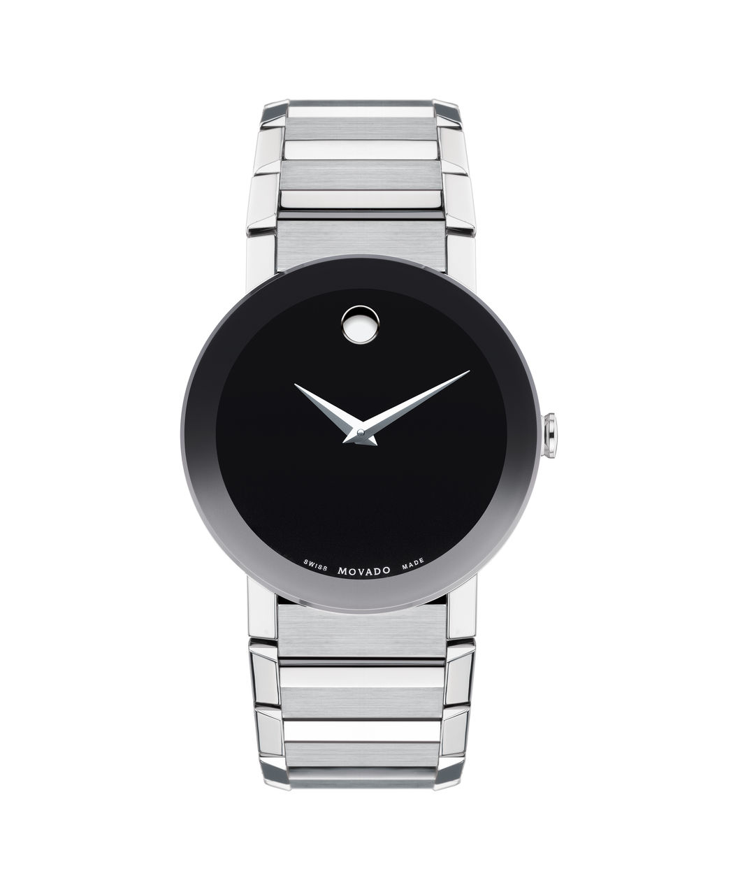 Men's Sapphire watch, 38 mm stainless steel bezel-free case with flat edge-to-edge dark metalized sapphire crystal, black Museum dial with silver-toned dot and hands, stainless steel link bracelet with deployment clasp.