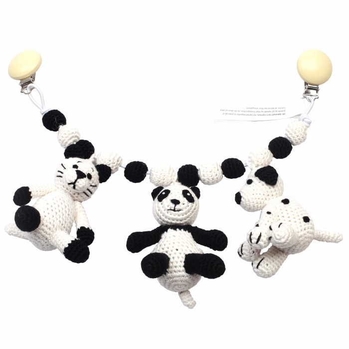 Large trolley mobile with three animals on. It is of premium quality and has many beautiful details. The animals easily turn, so that both mother and child can see them. The animals have rattle inside, so it makes a soft rattle sound when you shake them It is hand crocheted from Oeko-Tex 100 certified (Confidence in Textiles) bamboo yarn. We use very soft bamboo yarn, which is perfect for babies and small children. Furthermore, the bamboo yarn has the FSC certification, which means that nature has been taken into consideration both when cultivating and harvesting the bamboo. The stuffing is polyester. It is very popular as maternity gift or as a christening gift. The animals can be hand washed at 30 degrees Celsius. The wooden discs and the clips can be washed with a wet cloth. The product also has the CE mark.