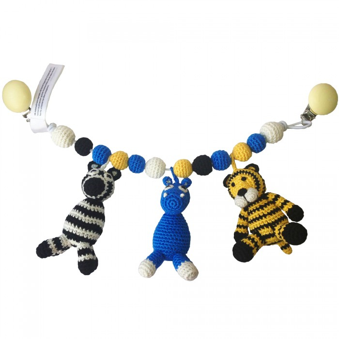 Large trolley mobile with three animals on. It is of premium quality and has many beautiful details. The animals easily turn, so that both mother and child can see them. The animals have rattle inside, so it makes a soft rattle sound when you shake them It is hand crocheted from Oeko-Tex 100 certified (Confidence in Textiles) bamboo yarn. We use very soft bamboo yarn, which is perfect for babies and small children. Furthermore, the bamboo yarn has the FSC certification, which means that nature has been taken into consideration both when cultivating and harvesting the bamboo. The stuffing is polyester. It is very popular as maternity gift or as a christening gift. The animals can be hand washed at 30 degrees Celsius. The wooden discs and the clips can be washed with a wet cloth. The product also has the CE mark.