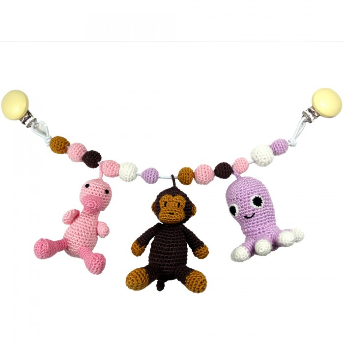 Large trolley mobile with three animals on. It is of premium quality and has many beautiful details. The animals easily turn, so that both mother and child can see them. The animals have rattle inside, so it makes a soft rattle sound when you shake them It is hand crocheted from Oeko-Tex 100 certified (Confidence in Textiles) bamboo yarn. We use very soft bamboo yarn, which is perfect for babies and small children. Furthermore, the bamboo yarn has the FSC certification, which means that nature has been taken into consideration both when cultivating and harvesting the bamboo. The stuffing is polyester. It is very popular as maternity gift or as a christening gift. The animals can be hand washed at 30 degrees Celsius. The wooden discs and the clips can be washed with a wet cloth. The product also has the CE mark.