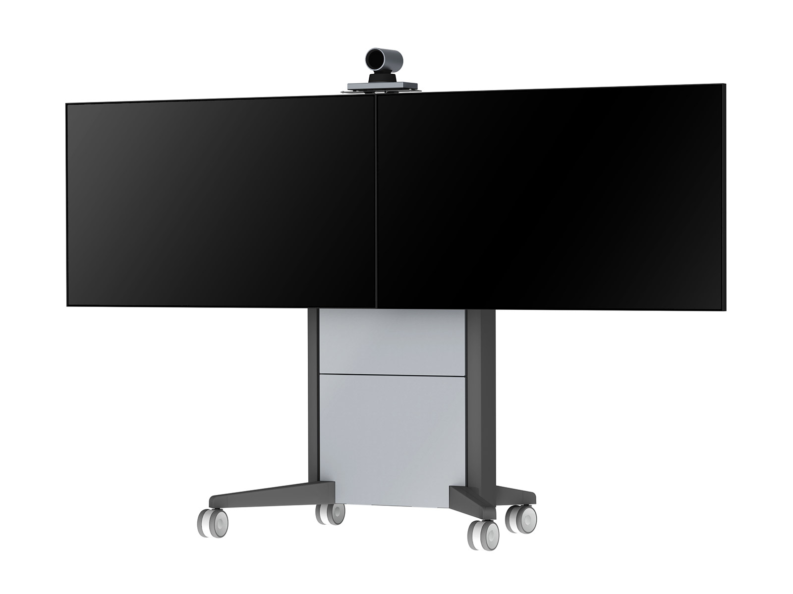 High-end videoconferencing trolley with space for double screens and a top-mounted camera compatible with screen sizes from 46" to 65".