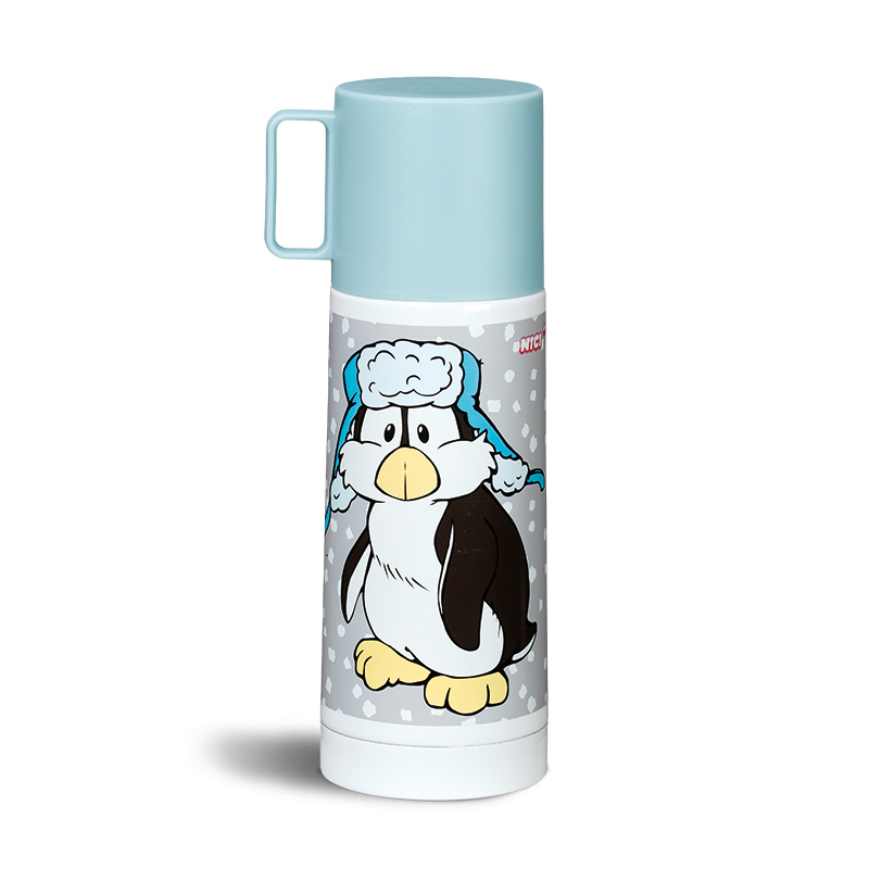 This thermos flask with NICI penguin Ilja keeps your tea and coffee warm. A turquoise mug is already included. Ilja, the grey-and-white penguin with the turquoise hat, can be see on one side, standing against a light grey background with swirling white snowflakes. On the back of the jug, Ilja wanders through a winter landscape.