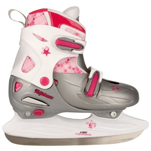 Figure Skate Girls Adjustable 3-section TPE preformed boot, adjustable in 4 sizes by pressing button at heel, 2x dual quick-lock, easy to replace by screwed connection, detachable inner boot made of polyamide with polyester lining, synthetic blade holder with stainless steel blades, not equipped with toe picks, incl. 1 spare dual quick-lock