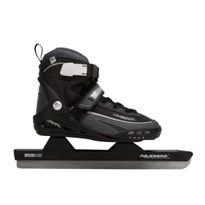 polyester ripstop/PVC leather semisoft boot, comfortable cushioned inner shoe with high-density foam, polyester lining with Thinsulate® warmth insulation, adjustable in 4 sizes by pressing button at heel, dual quick-fastener, easy to replace by screwed connection, with lacing, instep strap with velcro tape, TPE ankle-, heel- and toecap, light weight aluminium skate tube with stainless steel speed skate blades, incl. 1x spare dual quick-fastener