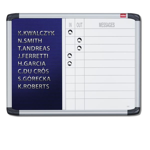 Create a professional system to identify whether staff are in or out using a NOBO Welcome In/Out board. The Nobo In/Out wall mounted board is the ideal way for individuals to display their whereabouts clearly & effectively. Each smart aluminium trimmed board, has a grooved felt section for listing names using the silver effect push-in characters supplied and a magnetic drywipe board for leaving messages.
