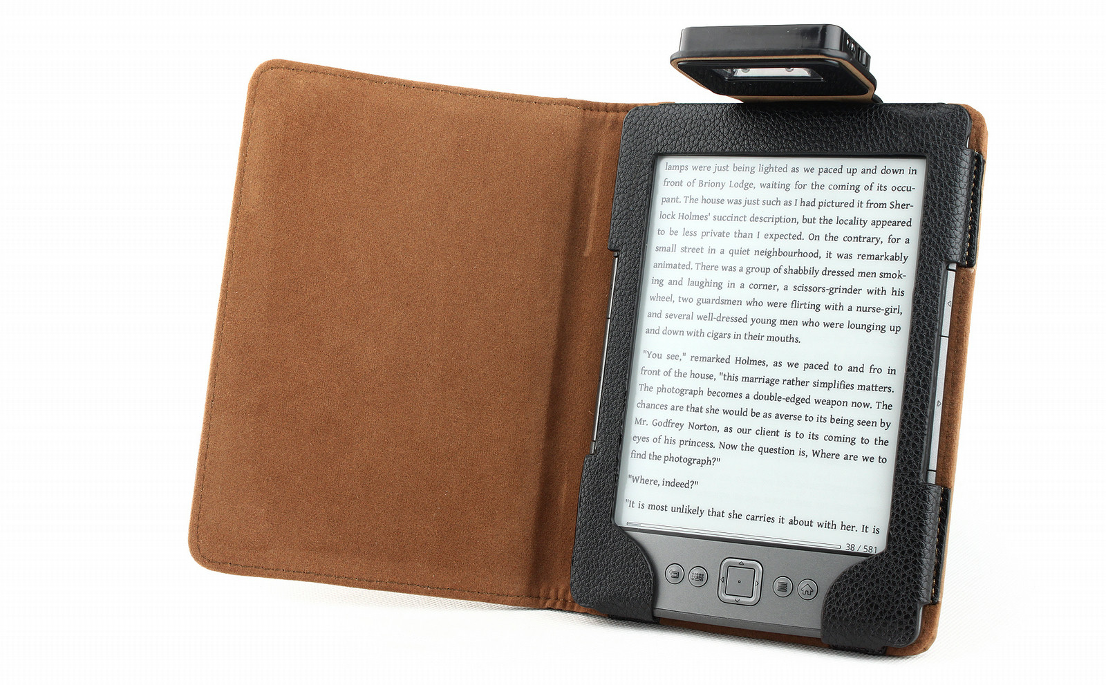 All buttons and connections can be reached while the e-reader is in the cover. The cover comes with a built-in LED light, so you can comfortably read in dark environments.