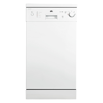 OK ODW 451-FS. Type: Freestanding, Door colour: White, Control panel colour: White. Number of place settings: 10 place settings, Noise level: 52 dB, Drying class: A. Energy efficiency class: A+, Energy consumption per cycle: 0.93 kWh, Water consumption per cycle: 12 L. Width: 450 mm, Depth: 598 mm, Height: 845 mm