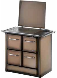 Enamelled steel body. Cast iron firebox and front. Large firebox and oven. Vitreous enamel cast iron front. Plate frame, fire screen, Towel rail support and grate in cast iron. Inner plates and rings in polished cast iron. Ash drawer. Oven thermometer. Enamelled oven and tray. Chrome-plated handles and towel rail. Hot water tank and ladle (optional)