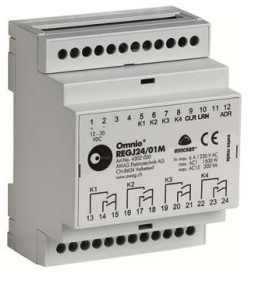 The Omnio blind actuator 4-channels REGJ24/01 is a device to control 230 V AC tubular motors of blinds, sun blinds, awnings, sliding gates or garage doors. Its eight potential free outputs are able to regulate four drives and these can be controlled by up to 30 Omnio radio transmitters. Each transmitter connected to the blind actuator can be programmed with four different functions, for example switch, push-button, push-button follower and Toggle. The actuator is available as Master including radio receiver or as Slave. The Master can be networked with up to ten Slaves through its integrated serial interface (ASB-Bus). Suitable as top hat rail mounted device for distributor mounting.
