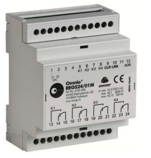 The Omnio top hat rail mounted switching actuator 4-channels REGS24/01 is a device for switching electrical loads. Its four potential free outputs are able to be controlled by up to 30 Omnio radio transmitters. Each transmitter can be programmed with one of four different functions, like switch, push-button, push-button follower and Toggle. The actuator is available as Master including radio receiver or as Slave. The Master can be networked with up to ten Slaves through its integrated serial interface (ASB-Bus). Suitable as top hat rail mounted device for distributor mounting.