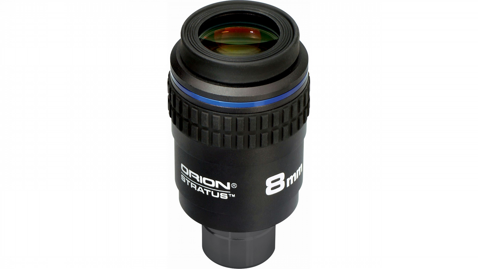 This 8mm Orion Stratus Wide-Field Telescope Eyepiece fits in both 1.25" and 2" focusers. It sports fold-down rubber eyeguards and a knobby rubber grip. The chrome barrel features a setscrew security recess and is threaded for filters. The telescope eyepiece comes with protective lens and barrel caps.
