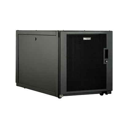 Enterprise cabinet, 12 RU, single hinge perforated front and rear doors with keyed swing handles, (2) solid single piece side panels with 1/4 turn locks, and casters. Fully assembled. Dimensions: 25.7"H x 23.5"W x 42.0"D (654mm x 600mm x 1070mm)