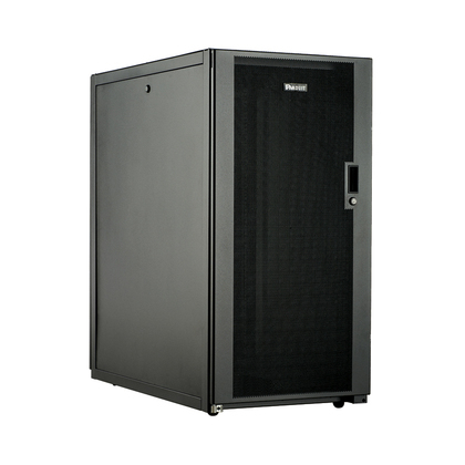 Enterprise cabinet, 24 RU, single hinge perforated front and rear doors with keyed swing handles, (2) solid single piece side panels with 1/4 turn locks, and casters. Fully assembled. Dimensions: 46.7"H x 23.5"W x 42.0"D (1187mm x 600mm x 1070mm)