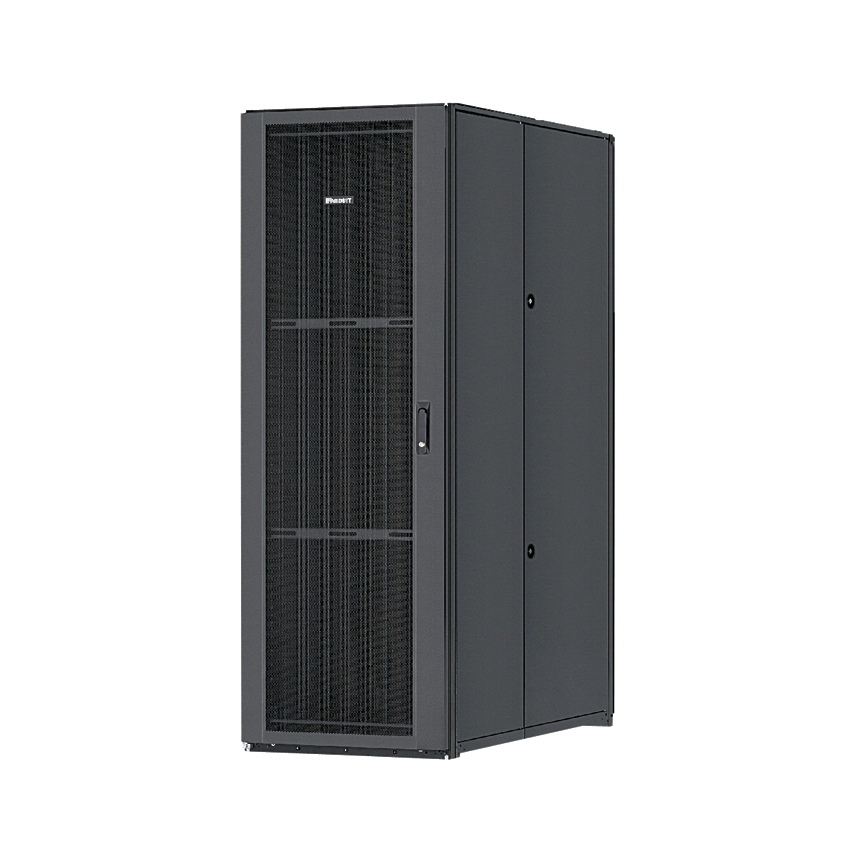 Net-Access™ S-Type Cabinet frame with top panel. Single hinge perforated front door. Split perforated rear doors open in the middle to minimize door swing footprint. Solid side panels (2), casters, POU brackets (1 set), cage nut rails (2 sets) and vertical cable management fingers.