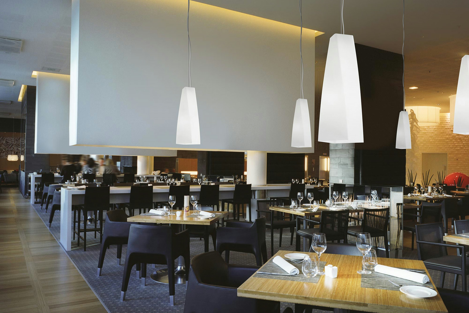 Floor, table, suspension and wall lamp in mat nickel metal. Blown white mat glass.
