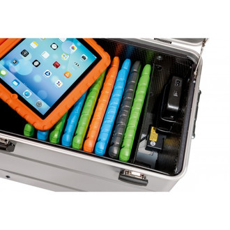 The PARAPROJECT® Case i10 Charge Only KidsCover is perfectly suited for classrooms and other educational institutions. The case offers enough storage space for up to 10 iPad G4, Mini 1, 2 & 3 and Air 1 & 2, safely kept in clever KidsCover protective cases. The station simultaneously charges 10 end devices with USB port via integrated Multi-Charge Hub. In order to make space for the iPad with KidsCover, this PARAPROJECT® Case i10 version does not have separators and notebook compartment. A particularly practical detail is its light own weight: this case i10 version only weighs a mere 8.5 kg. The tablets are perfectly protected and easy to transport. The matching KidsCover can be ordered separately - please indicate model and color preference. CH version with Swiss charging cable.