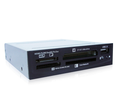 PEAK All-in-One Internal Card Reader, with 4 card slots and 1 extended USB port, is designed for Desktop Computer to use. The latest chipset of the card reader/writer can read most of the flash cards in market, including all the series of Compact Flash, IBM MicrodriveTM, Smart Media, Secure Digital, Secure Digital High Capacity Card, MultiMedia Card, Memory Stick and all the other flash cards. (Adequate adapters may need)
